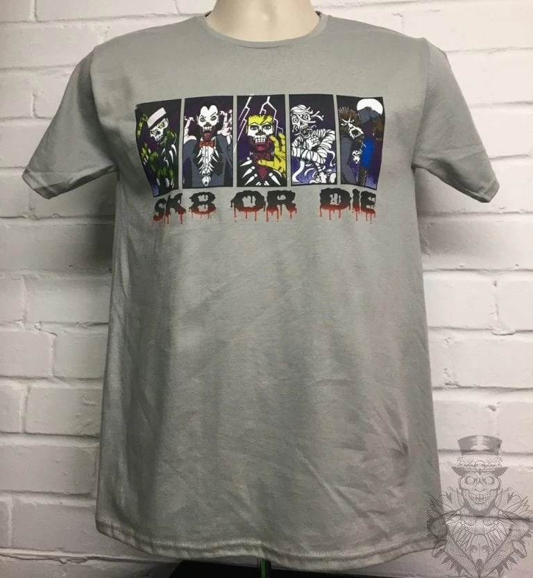 Sk8 or Die Classic Monsters T-shirt printed on a Zinc T-shirt in adult sizes.