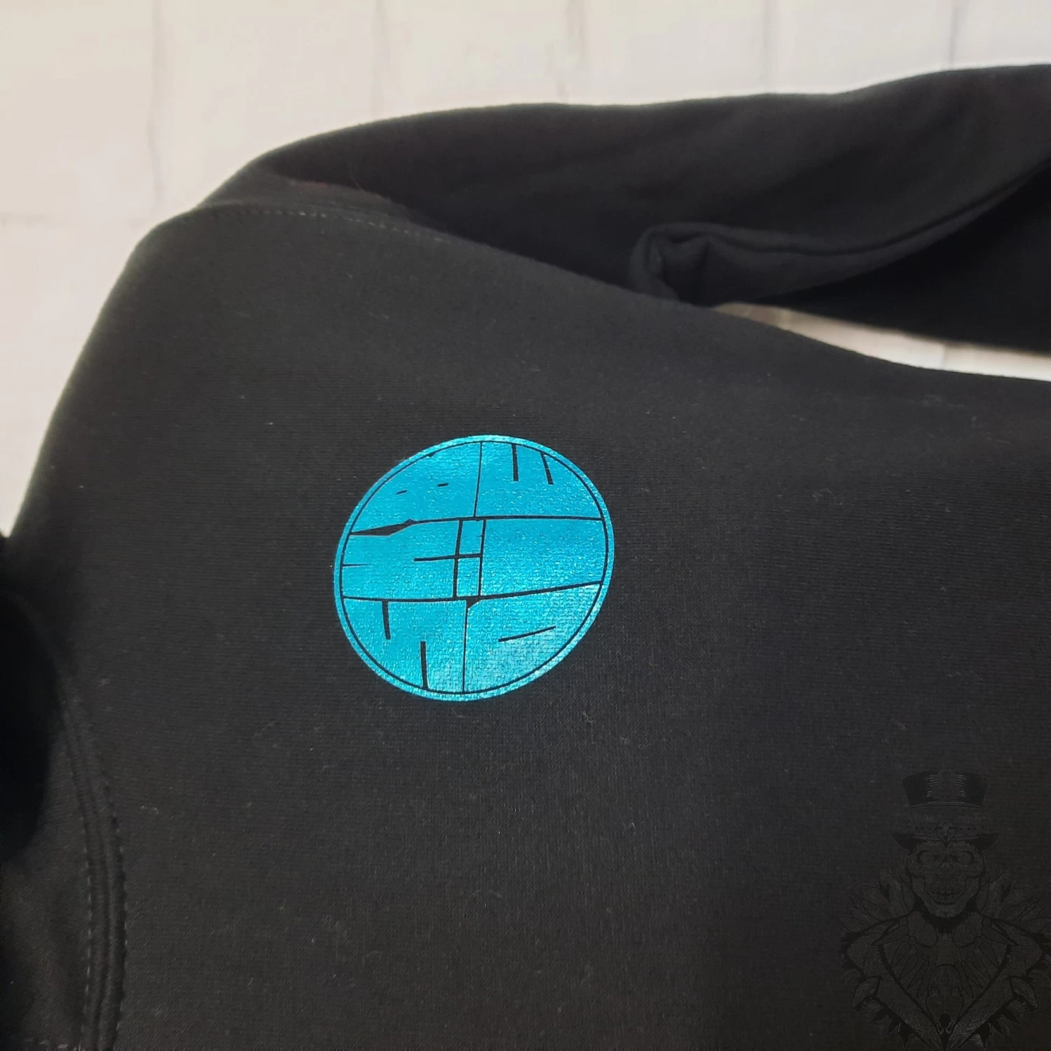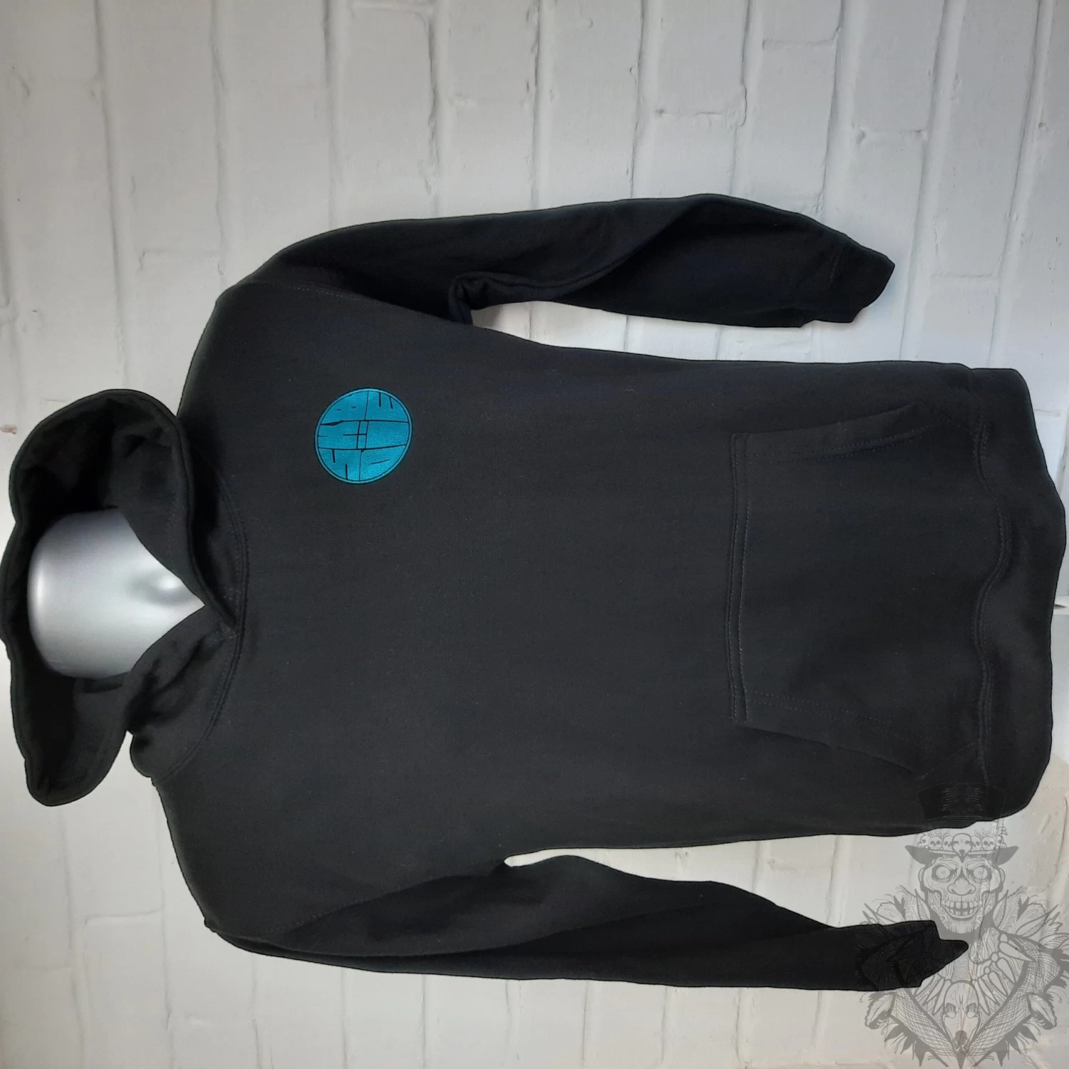 Black hoodie with the Sk8 or Die logo on the left breast and emblazoned on the back with the Sk8 or Die Baron in shiny teal foil.